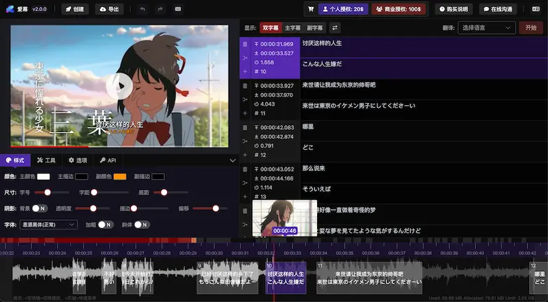 在线字幕编辑器,支持音频提取和字幕翻译,免费使用,自己部署需付