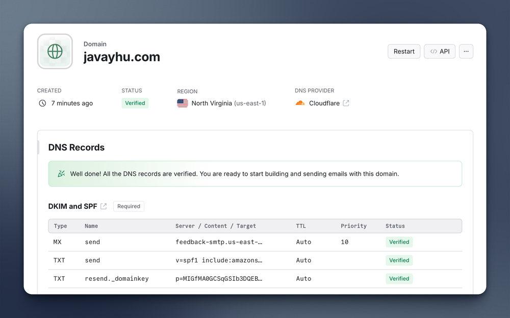 添加了DNS解析记录之后,回到Resend点击Verify然后等待验证通过。