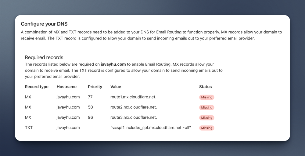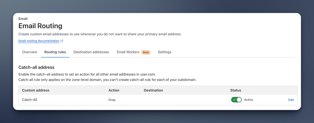接下来要配置的就是让Cloudflare帮我们把企业邮箱收到的邮件转发到我们的Gmail邮箱,这样就解决了收邮件的问题。