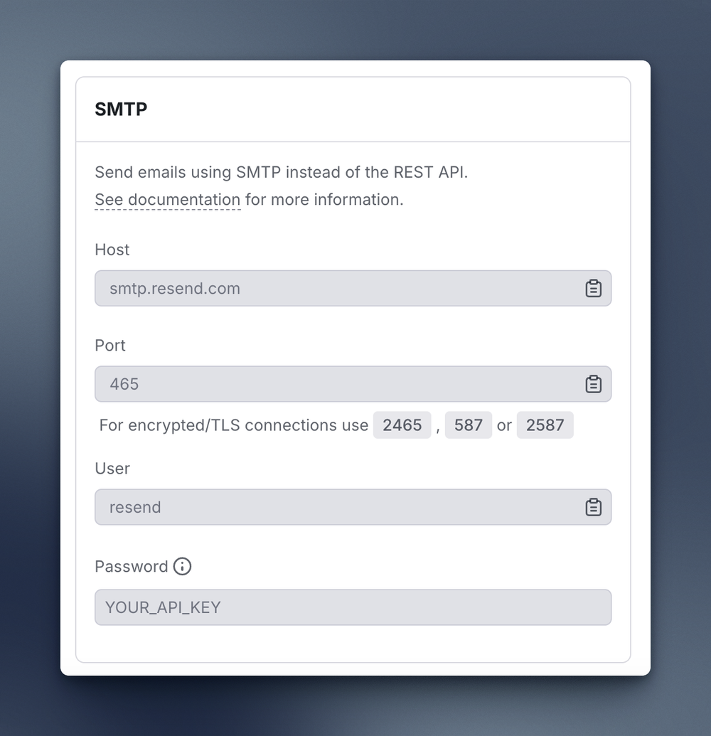 进入Resend的SMTP设置,这里就有企业邮箱的发送邮件的账号密码。
